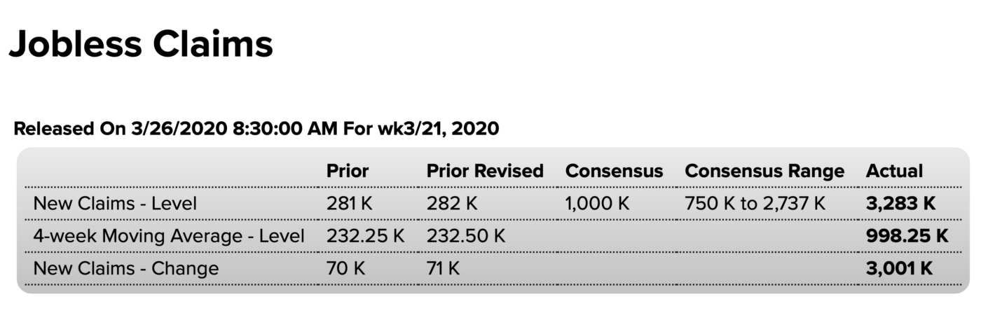 There’s only one way to say it…the situation is dire. Perhaps the worst economic disaster to ever hit our shores, 2nd only to the great crash of 1929. But give it a few more weeks, and we are likely to surpass that infamous mark. Jobless claims were released this morning, we all knew it would be bad, with economists predicting anywhere from 750k to 2,7 million new claims, and a consensus of 1 million, we new it would be bad. However, the number was significantly higher at 3.28 million! That is insane, but still not unexpected by most…I actually was surprised that the range and consensus on the report was so low.